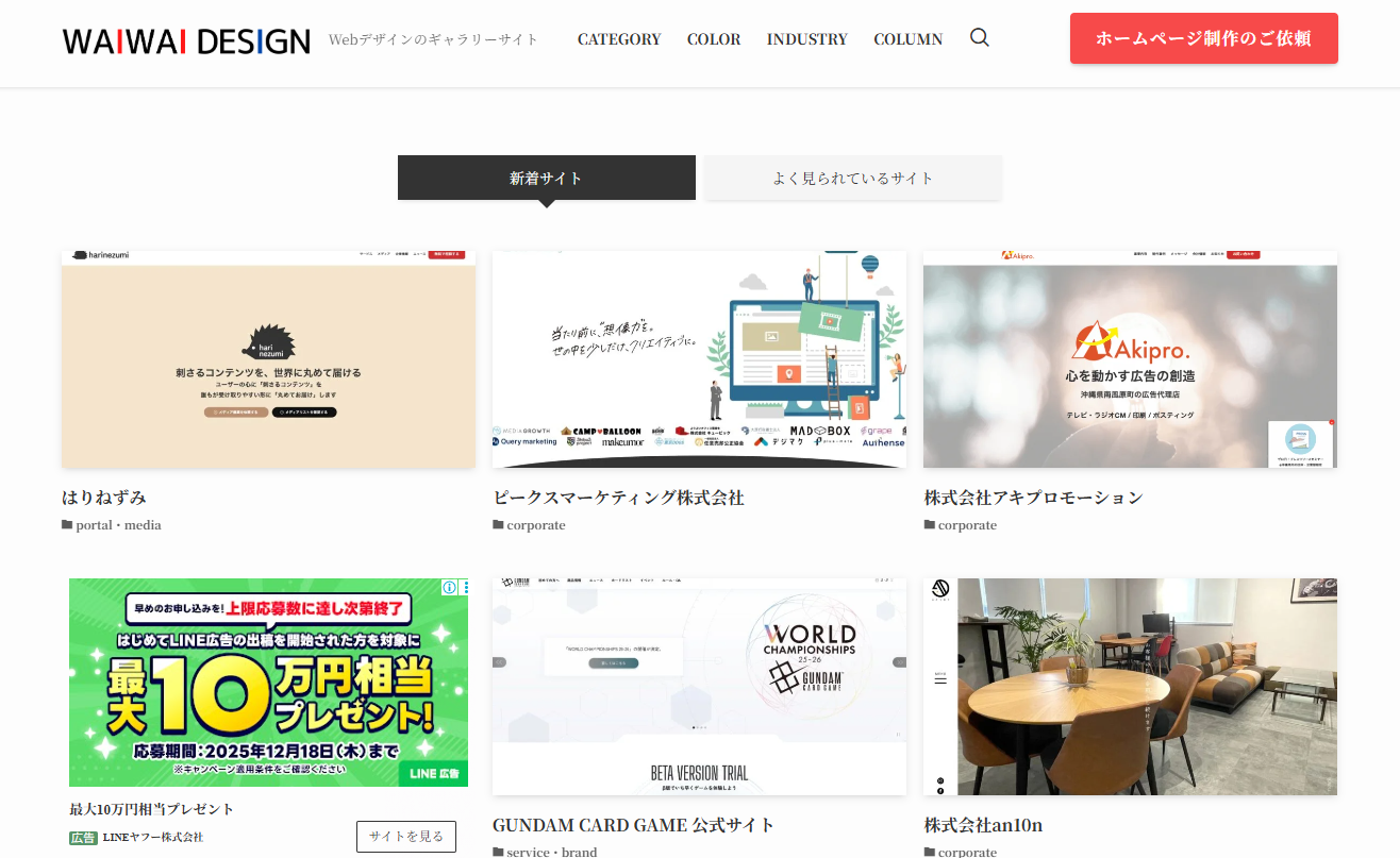 WAIWAI DESIGNは、ホームページのデザインギャラリーをまとめたサイトです。ホームページのデザインや制作をこなう際に、参考になるサイトを探した場合に活用できます。